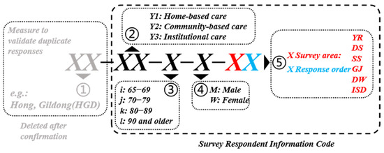 In addition, a verification procedure was introduced to prevent duplicate responses to the same question, thereby ensuring data reliability and accuracy. This procedure was designed to minimize inconsistencies and repeated responses and included systematic checks to maintain data integrity by cross-referencing potential duplicates using codes based on the respondents’ initials, type of eldercare system, age group, gender, and response order, as shown in Figure 3. The names encoded were solely for identifying data duplication. After cross-checking, the codes were reorganized based on the type of eldercare system, and the initial name codes were deleted.