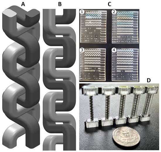These results demonstrate that single serpentines can be cleared, at least for channel widths of ≥400 m. As a result, the fabrication of double-serpentine devices, generally referred to as simply “serpentine”, was undertaken. The individual channels entwining in each pair are difficult to discern, particularly at smaller scales. Figure 1D shows an example of a double-serpentine device. Note that microchannels in these chips are printed with black resin, are non-functional and are for demonstration purposes only (see Section 2).