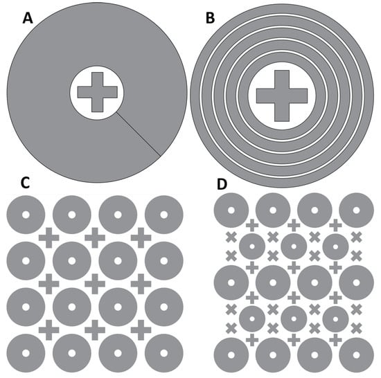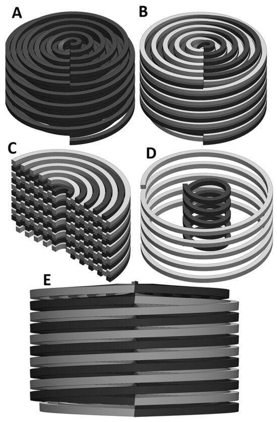 The fibers of the weave architecture [33] were homogeneously arrayed and then connected by a binary dendritic structure. The same arrangement makes sense with the serpentines. However, the advent of potato spiral and onion architectures suggests alternative heterogeneous arraying. Figure 4 introduces several categories of possibilities for such arrays. Figure 4A,B each show concentric arrays centered around a single serpentine. In these concentric arrangements, the radius can be increased as needed by ether increasing the outer radius of the potato spiral or adding additional concentric “layers” around the onion. Figure 4C,D show Cartesian arrays with serpentines intermixed with potato spirals. Figure 4C shows that the serpentine nests neatly into the gaps between the potato spirals, thus using the available space more efficiently. Using a heterogeneous array design, in addition to providing nesting and lateral scaling benefits, may allow for the simultaneous exploitation of the unique benefits of multiple individual architectures.