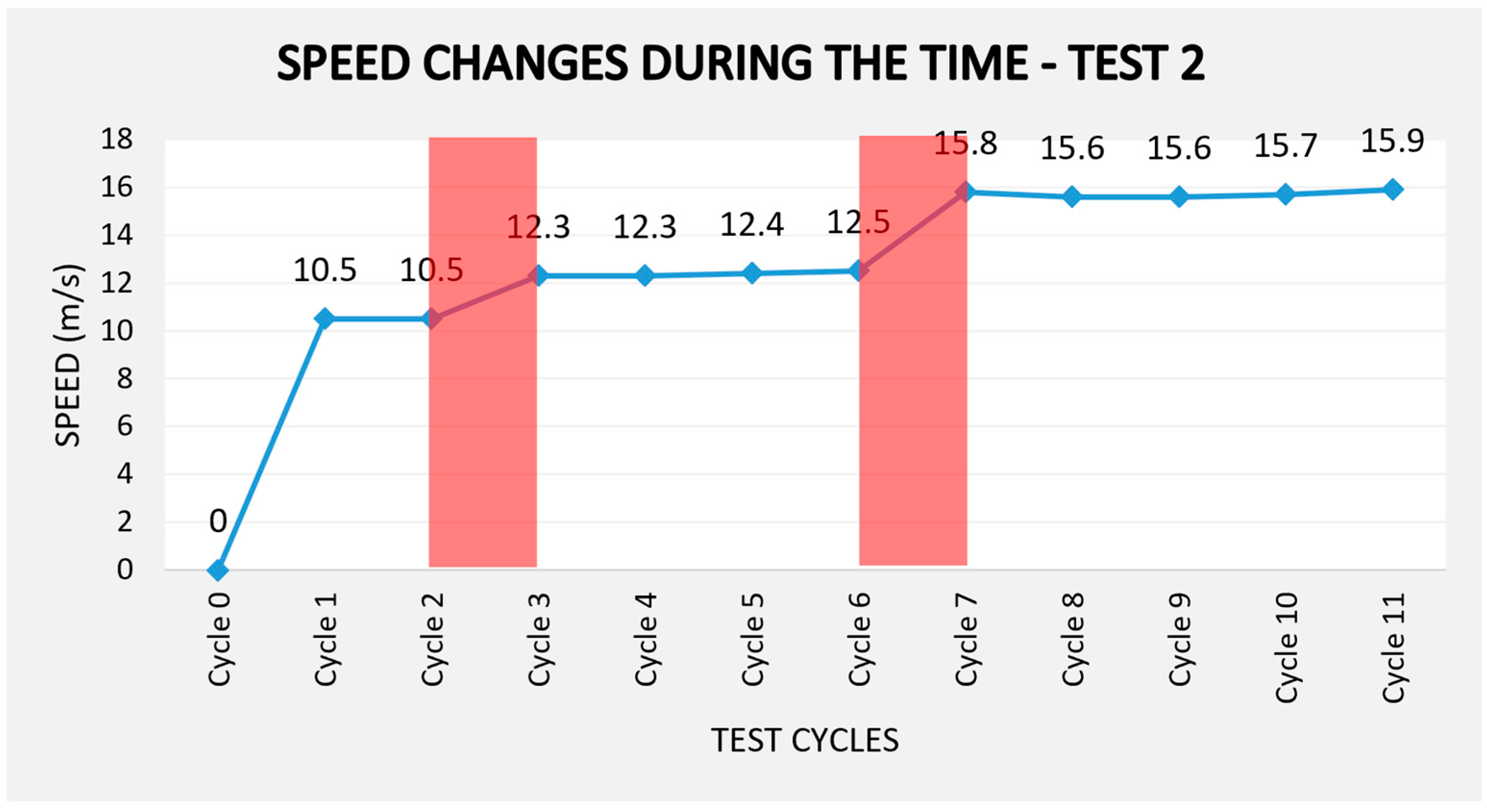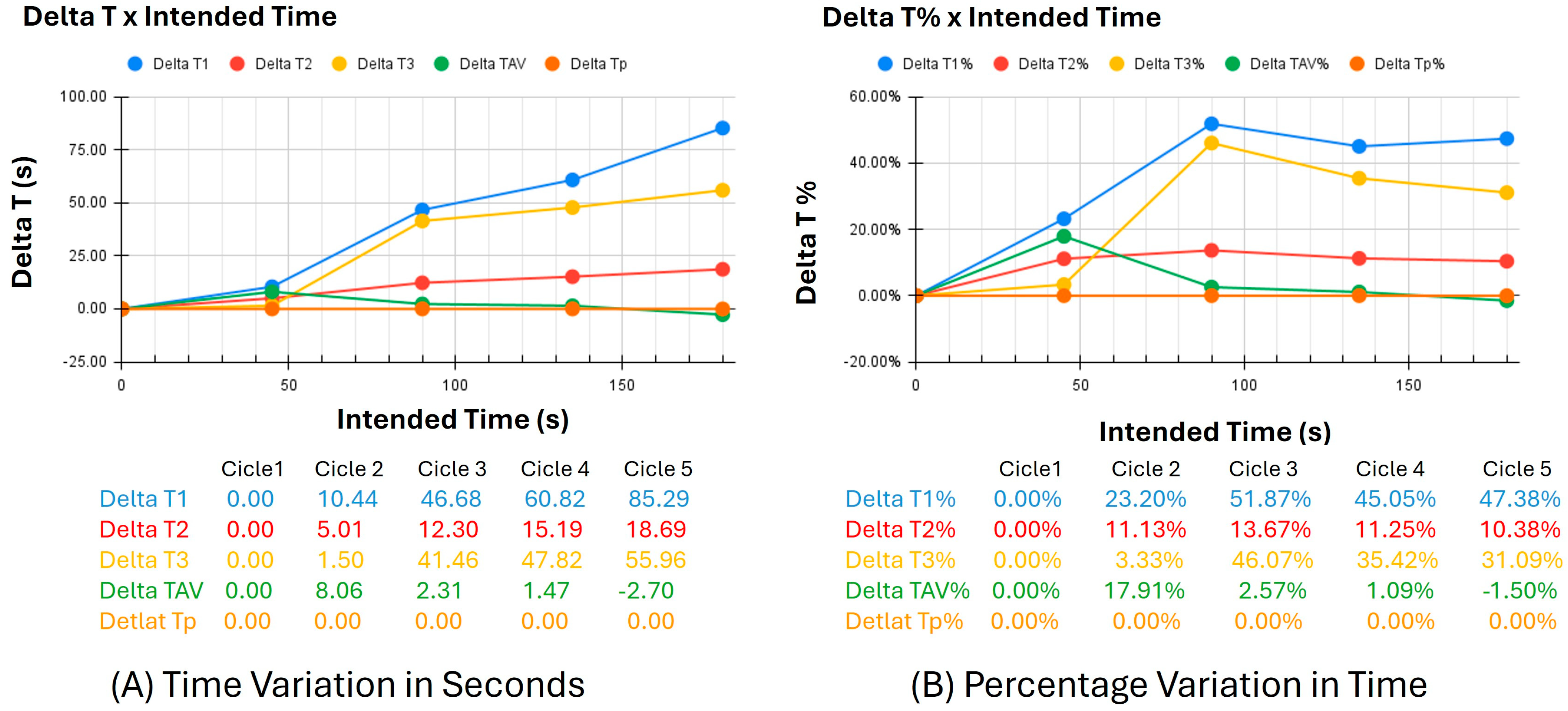 Figure 10 illustrate the variations in the test parameters, where chart (A) shows the time variation in seconds, and chart (B) depicts the percentage variation in time. The orange line (Delta IT% and Delta IT) represents the time reference for each of the four cycles analyzed. The blue, yellow, and red lines show the data collected without optimization. The green lines (Delta TSA% and Delta TSA) correspond to the cycles where optimization was applied.