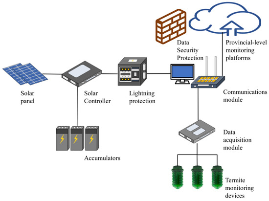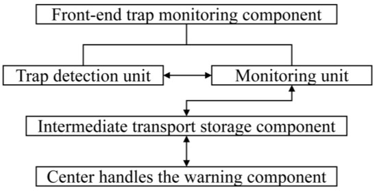 The architecture of the intelligent termite monitoring system consists of three main components: the front-end trap monitoring part, the intermediate transmission and storage part, and the central processing and warning part [26,27], as illustrated in Figure 1:
