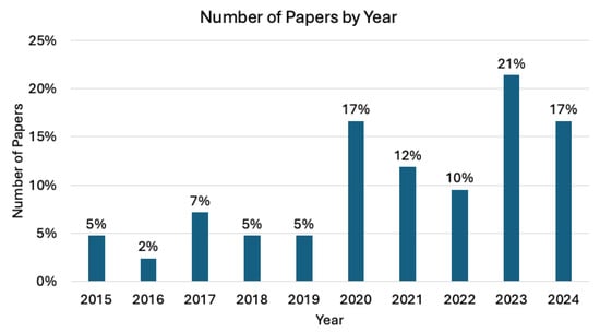 The search was conducted on the Scopus and Web of Sciences databases. This initial search produced 1782 articles (1024 and 758, respectively). These were then filtered to remove duplicates and include only publications in English and within the period from January 2015 to November 2024, i.e., the last 10 years, to consider only recent advancements in technology, reducing the set to 924 articles.