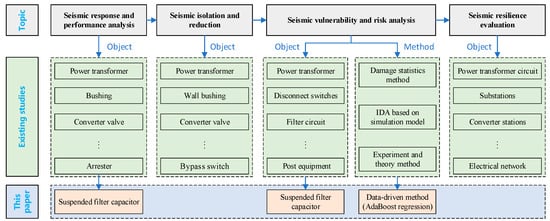 In view of this, scholars have undertaken seismic studies on various kinds of electrical equipment from different aspects to mitigate earthquake-induced damage. As shown in Figure 1, seismic studies on power systems develop continually from performance evaluation to system resilience. At the earliest, some researchers analyzed and evaluated the seismic performance of much equipment, such as power transformers [4,5], bushings [6,7], surge arresters [8], and other post equipment [9,10,11,12,13]. Based on the seismic response analysis, some effective seismic mitigation measures were proposed for electrical equipment to improve their seismic performance, e.g., a double friction pendulum [14], wire ropes [15,16], multiple tuned mass dampers [17], friction dampers, and prestressed tendons [18]. Nonetheless, the majority of the prior seismic investigations have been on transformer and post-type apparatus. Indeed, suspension equipment requires both design and protection. While Yang et al. assessed the seismic performance of a suspended 800 kV converter valve and proposed a restraint method for its protection [19], there is a deficiency of seismic studies concerning suspended filter capacitors, which possess a markedly different structure from the converter valve.