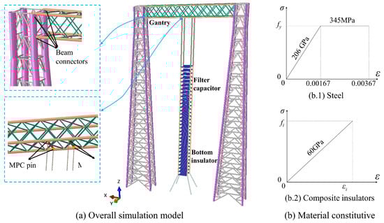 The steel gantry is composed of Q345 steel with a density of 7850 kg/m3, an elastic modulus of 206 GPa, and a Poisson’s ratio of 0.30. Its constitutive adopts a bilinear model with a yield platform, as shown in Figure 3b. It should be mentioned that the stress of the gantry induced by earthquakes generally would not exceed the yield strength because the possible local instability will occur prior to the yielding. Typically, there is no local instability for the components of the steel gantry unless the extreme strong earthquakes occur. Moreover, the composite insulator rods have a significantly lower safety factor than the steel members. Therefore, this study considers only the failure of the insulators. For the steel materials, a bilinear constitutive model was employed for simplifying the computations, which also can accelerate the computation process. For the GFRP composite insulators, the density is 2160 kg/m3, the elastic modulus is 60 GPa, and the Poisson’s is also 0.30. Its constitutive adopts a linear-elastic model due to its brittle performance, as shown in Figure 3b, which has been approved in relevant literature about substation equipment modelling [3,7,14,43,44]. The overall damping ratio of the model is set to 0.02 according to the relevant literature [4,7,14] and codes [49,50].