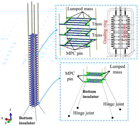 A simulation model of the suspended filter capacitor was established by ABAQUS software v6.14.3, as shown in Figure 3. The structures which include the door-type gantry and the support frame used for the capacitors are simulated by B31 beam elements because they have obviously larger lengths than the cross-sectional dimensions. The simulation details of only the filter capacitor are shown in Figure 4. For the suspended insulators, they have less cross-sectional sizes, and only the three translational degrees of freedom of their two ends are restricted. Their ends can freely rotate which exhibits the significant axial stiffness, so truss elements are suitable for the simulation. In each layer of the filter capacitor, the capacitor modules that are installed on the support frame have a large stiffness with a high natural frequency. This research considers only their mass effect, since they exert weights to the suspension insulators through the frame, and this study focuses on the seismic responses of the suspension insulators instead of the capacitor modules. The stiffness influence of the capacitor modules is thus ignored. Hence, the capacitor modules are simplified as the lumped masses that are uniformly attached to the support frames, as shown by the green points in Figure 4.