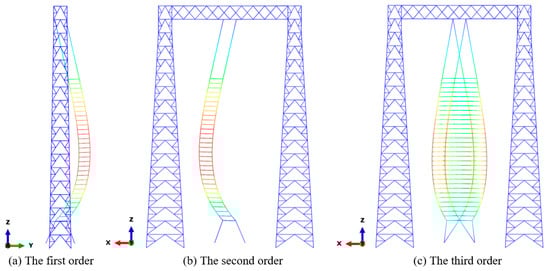 It is necessary to understand the structural dynamical characteristics before conducting the seismic performance analysis. As expected, due to its suspension structure, the filter capacitor exhibits an obvious geometric nonlinearity. The main reason is the hinge joints between the suspended insulators of the layers. Because of such a flexible structure, it shows dramatically lower vibration frequencies than the steel door-type gantry. The earliest mode related to the steel gantry is the 23rd mode that displays a coupling vibration of the filter capacitor and the gantry. The corresponding frequency is 1.78 Hz. The first three vibration modes of the structure with a pre-tension force of 20 kN are shown in Figure 5. The vibration mode information and effective mass are summarized in Table 2.