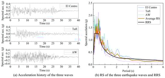 According to Chinese code GB 50260-2013 [49], the seismic qualification of electrical installations requires three or seven sets of ground motions. If selecting three sets of ground motions, there must be at least one artificial wave. Therefore, in this study, two sets of three-directional natural ground motions, El Centro wave and Taft wave, as well as one artificial wave (AW), were selected as the input earthquake waves. Their acceleration history with a PGA of 0.4 g in the main-vibration direction is shown in Figure 6a while the response spectra (RS) shown in Figure 6b. The required response spectrum in the Chinese code GB 50260-2013 [49] is also plotted. It can be found that the average RS can nearly envelope the RRS, which meets the requirements of the selection of ground motions. Thus, these three sets of ground motions are employed to calculate the seismic response of the filter capacitor. Because the vibration frequency in Y direction (0.18118 Hz) is slightly less than that in X direction (0.18133 Hz), the main-vibration direction of the filter capacitor is set to the Y direction. The PGA ratio of the three directions is determined as Y:X:Z = 1:0.85:0.65 per the relevant code [49]. The PGA in the main-vibration direction is set to 0.4 g according to seismic fortification requirement.