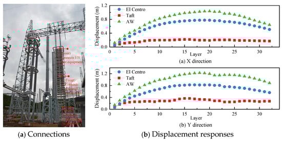 As mentioned before, the filter capacitor will produce a large horizontal displacement under earthquakes. The filter capacitor has a type of LBQ-800-68M and its connections are shown in Figure 7a. There are three main connections to other equipment at the top, middle, and bottom layers with tube busbars or flexible wires. Once the connecting terminal of the filter capacitor produces a large displacement, the connection busbars or wires would be tensioned, further bringing in damage to the filter capacitor and the interconnected equipment. The excessive stretching of insulators can easily cause explosions, and severe wire pulling can cause structural damage or fires to adjacent post-type equipment. Those failures have been observed in previous post-disaster investigations for strong earthquakes, which would bring in power outage [51,52]. In addition, the large horizontal displacement will result in the distance decreasing between the filter capacitor and the gantry, which may induce an electrical insulation accident. Therefore, the horizontal displacement is a significant factor when considering the seismic performance of the suspended filter capacitor.