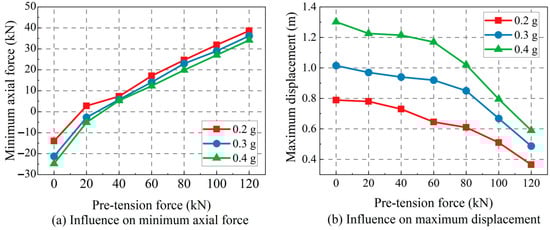 The influence of the pre-tension force on the minimum axial force and the maximum displacement is shown in Figure 9, in which the negative axial force represents the pressure. From Figure 9a, we can understand that the minimum axial force gradually reduces as the PGA increases, and the minimum axial force increases with the increase in the pre-tension force. When the pre-tension force is larger than 40 kN, the insulators will not produce pressure, which meets the requirements of IEEE 693 std [50]. Therefore, the pre-tension force is recommended to be adjusted so that the pressure generating can be avoided in the suspended insulators.