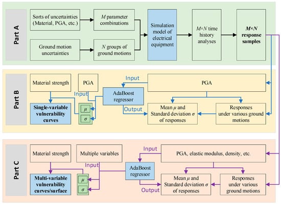 On the basis of the aforementioned basic theory, the seismic vulnerability analysis method based on the AdaBoost regressor was proposed and the steps are summarized in Figure 11. There are three main stages for the overall vulnerability assessment: