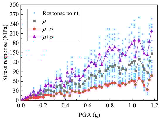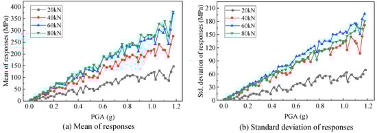 At present, the data have not been predicted by AdaBoost regressors since the responses derive from the time history calculations, thereby the results represent the actual situation. In Figure 22, it is distinct that the mean value will increase as the PGA increases. When the pre-tension force increases from 20 kN to 40 kN, the mean and standard deviation values significantly increase at one PGA point, whereas there is a relatively small or zero increase when the pre-tension force is larger than 40 kN. The main reason is that the pre-tension force can increase the stiffness of the filter capacitor but its reinforcement influence would be weakened with increasing. In other words, the relationship between the stiffness and pre-tension is a nonlinear one with a gradually decreasing slope. When the pre-tension force is relatively small, its increase would significantly enhance the structural stiffness, however, once it meets the saturation, the structural stiffness would not nearly increase. The influence on standard deviation is also in the same way. This law is consistent with Figure 8 that exhibits the influence of the pre-tension force on responses.