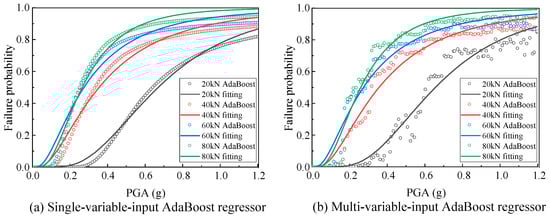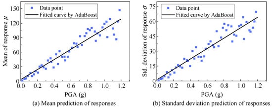 Section 4.4.2 demonstrates the single-variable-input seismic vulnerability curve that predicts the failure probability based on the PGA. Other parameters are considered in the statistical calculation. Nevertheless, the input would be multi-variable once the failure probability is estimated not only by PGA but also by other parameters. Therefore, this part establishes the AdaBoost regressor based on multiple parameters as inputs and the responses as outputs. For the given PGA and material parameters, ground motions would change, which results in various responses, so there are also a mean μ and a standard deviation σ. AdaBoost regressors will be used to replace the mappings from the given PGA and material parameters to the mean μ and standard deviation σ, respectively. Then, the AdaBoost regressors can be utilized to predict more μ and σ values when inputting more parameter combinations. The μ and σ values, which represent a distribution, can output the failure probability by inputting one PGA. Then, the data points of failure probability can be obtained as PGA changes, so a seismic vulnerability curve also can be obtained by fitting using log-normal distribution as shown in Equation (3).