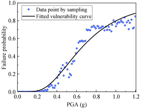 in which μ and σ are the logarithmic mean and logarithmic standard deviation, respectively, and x is the intensity measure. Obviously, they are the two critical parameters that can determine the overall function. For electrical equipment, the use of PGA as the IM of the fragility curves is based on the following reasons: (1) PGA is a straightforward and commonly utilized index for quantifying ground motion intensity in seismic evaluations of substation equipment, as its value is readily accessible. (2) The Chinese seismic design regulations for structures and electrical installations utilize PGA as the vital intensity measure for delineating ground motion intensity and seismic hazard correlations. (3) Extensive literature about the seismic fragility of substation equipment primarily uses PGA as the IM, hence encouraging its selection in this work for the fragility analysis of power transformers. Therefore, this study adopts PGA as the IM in the fragility analysis [7,20,21,55]. Given a PGA range, a fitted vulnerability curve can be obtained via Equation (3) and then is used to estimate the structural failure risk based on the PGA.
