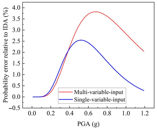 To investigate the influence of the sample groups (i.e., the number of the training samples) on the prediction errors, and validate the effectiveness of the use of 50 samples in this study, a sensitivity analysis was conducted. Using the same method and procedure described in this paper, given M = 10~70 groups of parameter combinations, which will be used for training the AdaBoost regressors, the maximum errors between the predicted single-variable-input fragility curves and the IDA-based fragility curve are shown in Figure 21. As the number of the sample groups increases, the maximum probability error is reduced overall. However, the increase in the samples requires larger computational quantity, thus an excessive computational cost would reduce the advantages of the proposed AdaBoost-based approach, because the use of IDA could also achieve the goal. Therefore, this work selects the number of 50 as the final number of sample groups, considering the efficiency and the accuracy at the same time.