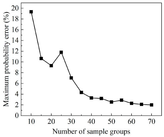 The maximum probability error of seismic vulnerability curves versus the number of sample groups.