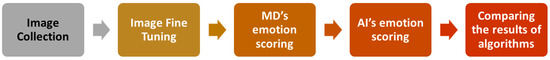 After comparing the algorithms and selecting the highest performance algorithm (ViT), this study demonstrates the comparisons of AI’s emotion forecasts and MD’s emotion scores. According to the comparison results, the emotion suggested by the algorithm demonstrates more than 80% similarity, which means that 8 to 11 pairs of emotions forecasted by the AI algorithm would be the same as the MD’s emotional recommendation (Figure 8).