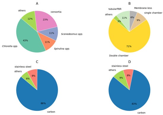 There is no clear correlation between power density and microalgae species, mMFC configuration or electrode material (Figure 6). Notable variability within and between groups could be highlighted for microalgae species. Chlorella spp. and Scenedesmus spp. exhibit particularly broad ranges of power densities, suggesting that under certain conditions, they can achieve very high power outputs, while consortia display more moderate values with a few high outliers. Dual-chamber configuration, as the most studied one, has a wide range of power densities, also presenting the higher power densities. Single-chamber configurations have fewer data points, primarily in the lower range, while the “others” category includes some very high values, highlighting that less conventional setups can still achieve substantial power outputs. For example, 474 mW m−2 in a novel self-breathing oxygen-consuming carbon felt SOC was integrated into the PBR-MFC to optimize O2 concentration distribution and separate microalgae/bacteria [110].