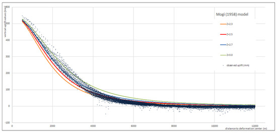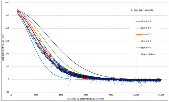 Figure 4 shows the best fitting Gaussian curves obtained by varying the parameters. It is evident that the Gaussian shape is not very similar to the data decay as a function of distance. In particular, even the best fitting curve, obtained for σ = 2.0, almost systematically overestimates the uplift at a short distance, while it underestimates uplift above 4500 m of distance. Nor varying the shape parameters can give a better fit to the observed data.