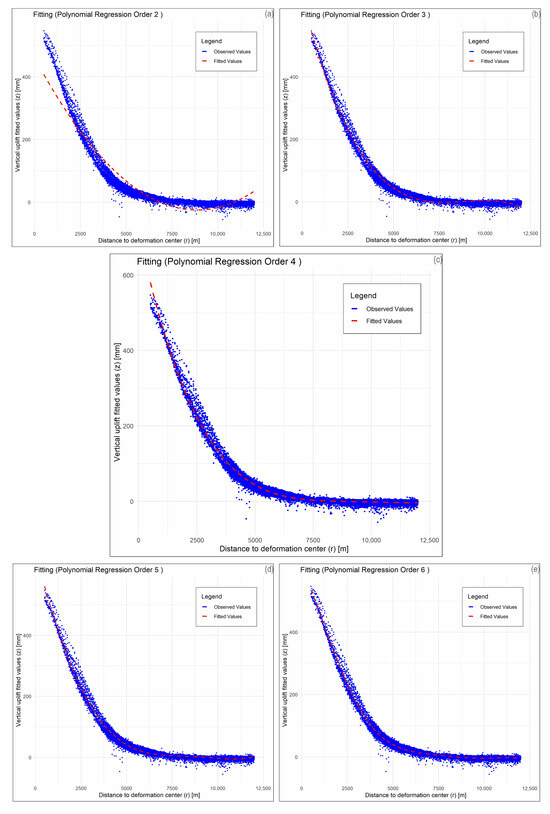 We have to stress that we searched for an axial–symmetric function giving the best possible fit to the data. The analysis and computation procedures involved the use of R software. The distances to the deformation center (denoted as r), which were calculated using ArcGIS Pro, were imported into R along with the vertical uplift values (z) that were measured by satellites at each specific target point. Then, a series of polynomial curves describing theoretical radial ground deformation with a progressively higher accuracy were generated by using the imported dataset of r and z values (Table 2). These polynomials were derived up to the 20th degree; in Figure 6, we show only curves up to 6th degree due to almost fully overlapping for curves of degrees higher than 6. Coefficients for polynomial curves are shown in Table 3.
