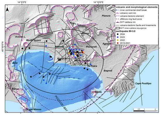 The geology of the study area is mainly characterized by volcanic units, made up of pyroclastic deposits, tuffs and ignimbrites, and by recent alluvial, colluvial, slope, and coastal deposits (Figure 1). The main volcano tectonic structure is formed by the structural rims forming the NYT caldera and more recent volcanic vents [42,53,54,55,56,57], as clearly recognized on land by morphological scarps (Quarto, Pianura, Soccavo, Posillipo, etc.) and in the Pozzuoli Bay offshore by the presence of a ring-fault system [41,42,58,59]. N–S trending fault segments, including the Bacoli and Baia faults and the Monte Nuovo fault, delimit the western inner border of the caldera; several E-W-, NW-SE-, and NE-SW- trending fault segments are present within the central resurgent area and the eastern caldera border (Figure 1). The observed crosscutting relationships indicate that the recent E-W and N-S structures overprint the NE-SW and NW-SE lineaments, which are inherited regional trends linked to the Pleistocene extensional tectonics [40,56,60,61].