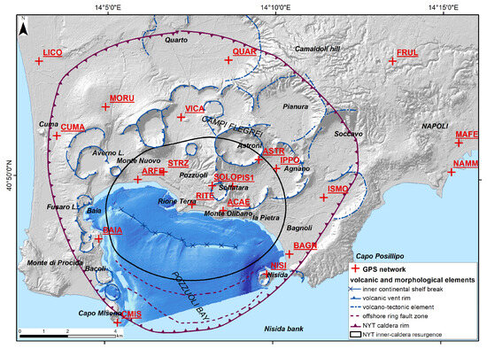 During the last 2100 years, the central sector of the Campi Flegrei caldera has undergone alternating phases of subsidence and uplift in the range of about 20 m, with maximum values centered in the Pozzuoli town central area, associated with fumarolic and hydrothermal processes, that are locally referred to as ‘bradyseism’ (e.g., [62,63]).