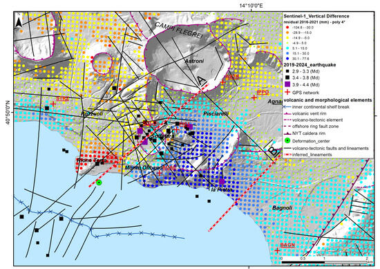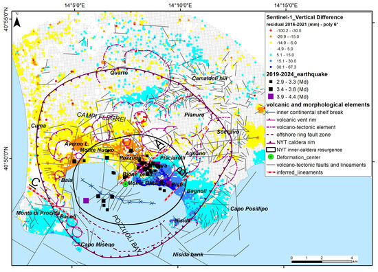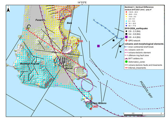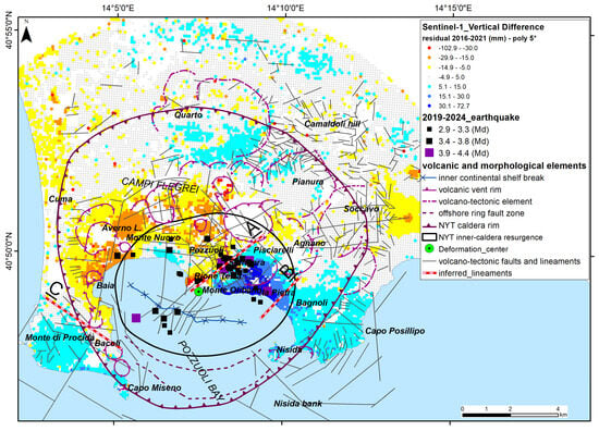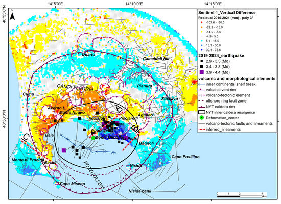 Ground deformation during unrest phases is characterized by high uplift and/or subsidence rates, related to inflation and deflation of the caldera floor due to magmatic and/or hydrothermal processes. It is usually characterized by marked radial or elliptical symmetry (first-order ground deformation), which rapidly decreases with distance from the caldera center. The general, symmetrical pattern of ground deformation is indicative of the main source activated, which can be magmatic or hydrothermal [7]. However, mostly hidden by the main field, ground deformations are also affected by structural discontinuities or secondary inflation sources, i.e., faults and/or smaller pressure sources including rising magma dykes, etc. Investigation of the smaller, second-order anomalies of unrest-related ground deformation is generally neglected, possibly leading to deficiencies in hazard analysis of the unrest phenomena and hiding the identification of possible pathways for magma rising, eventually leading to an eruption.