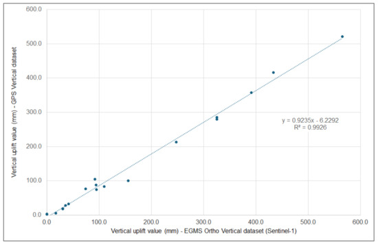 Then, the two datasets (vertical GPS and Ortho Vertical Sentinel-1) were compared, showing a very high correlation, as described in the Results section.