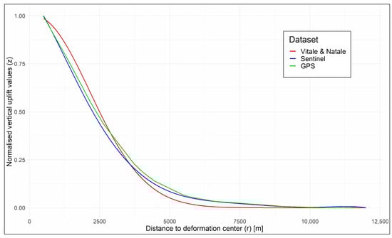 The Ortho Vertical dataset was implemented by calculating—using ArcGisPRO 2.3.1. software—the distance r to the caldera’s center of maximum deformation for each point, as defined by several authors [20,84,101,102]. Values of r lower than 500 m have not been considered for the calculation of the polynomial curves, considering that many sectors within this distance to the deformation center fall within the sea, and few uplift values are available.