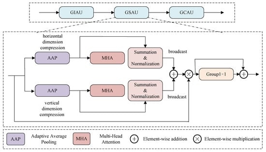 Figure 3 shows a schematic diagram of the GSAU, where the input of the GSAU is set to . First, f is sent to the pooling layer that is globally averaged in the horizontal and vertical directions to obtain and ; then, we perform dimension extrusion on and to obtain and . Then, we send and to two multi-head self-attention modules to obtain and , and we perform dimension expansion on and to obtain and . Then, we use the broadcast mechanism to sum and and multiply them by f. Finally, the product is convolved with and then added to itself to obtain the final output . The specific arithmetic expression is as follows: