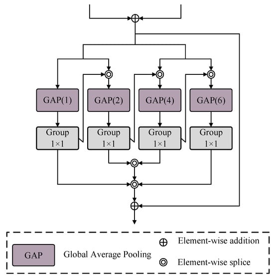 A schematic diagram of the PRU is shown in Figure 5, and the input of the PRU is set to ; we sum and to obtain f. First, we send f to the pooling layer with a core of 1; then, the result is concatenated with f and sent to the pooling layer with a core of 2 and a convolution of . After that, the result is concatenated with f and sent to the pooling layer with a core of 4 and a convolution of . Similarly, the result is concatenated with f and sent to a pooling layer with a core of 6 and a convolution of . Finally, the results of the four convolutional layers are concatenated in the channel dimension and added to the original input to obtain the final output . The specific arithmetic expression is as follows: