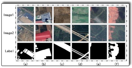 The LEVIR-CD dataset is derived from Google Earth imagery of Texas, USA, spanning from 2002 to 2018. A total of 637 pairs of 1024 × 1024 resolution remote sensing images make up the dataset. With a time span of up to 14 years, the dataset contains a wide range of change areas, including residential areas, apartments, vegetation areas, garages, vacant land, highways, and other locations. In addition, the dataset also takes into account seasonal and lighting variations, which are crucial for testing the effectiveness of the algorithms. Due to GPU limitations, we have cropped the original images of 1024 × 1024 into 4528 pairs of 256 × 256 remote sensing image pairs. Among them, 3808 pairs are used for training, and 720 pairs are used for prediction. A sample image is shown in Figure 7.