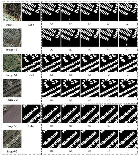 In Figure 7, the samples in column (a) represent regular change areas, column (b) shows small and densely distributed change areas, column (c) displays scattered change areas with significant spectral variations. Columns (d–f) show samples with a lot of interference information but no actual change areas. It is important to note that the labeled change areas in the LEVIR-CD dataset do not include the change areas in columns (d–f). Therefore, the change areas in those columns can be considered as interference information. This can to some extent enhance the model’s generalization performance.