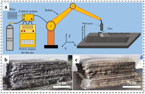 (a) WAAM system and macroscopic morphology of (b) alloy 1 specimen, (c) alloy 2 specimen.