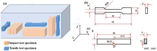 Sampling position (a) of impact and tensile specimens, size of tensile specimen (b), and impact specimen (c).