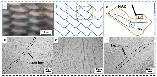 Deposition unit and its microstructure. (a) Macro-morphology of deposition units. (b) Schematic of the deposition unit enclosed by the fusion line. (c) Schematic of the deposition unit. (d–f) Microstructure within deposition unit.
