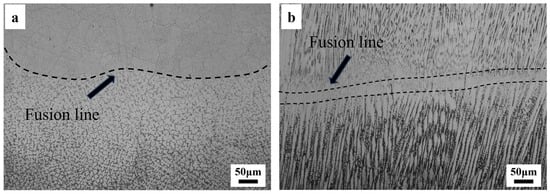 In Figure 6a,b, the dark regions and deposition units on the Y–Z section of WAAM-fabricated invar alloy are periodically distributed. It has been confirmed that the dark region in Figure 6a is actually a heat-affected area formed during deposition [23]. Figure 6c shows a singular deposition unit, wherein the microstructures exhibit variation across different locations, primarily associated with the thermal dissipation conditions of the molten pool during solidification and the cyclical thermal input throughout the deposition process. During the cooling of the molten pool, the substantial temperature gradient of the liquid metal at the bottom results in an elevated heat dissipation rate, consequently leading to the formation of fine grains. The liquid metal at the core of the molten pool exhibits a reduced temperature gradient and diminished heat dissipation, resulting in a larger grain size. At the same time, as the molten pool during deposition radiates heat to the air above and to the metal below, a temperature gradient along the Z-axis is formed, and the crystals grow in the direction of the highest temperature gradient, eventually forming columnar grains along the Z-axis [24]. The heat-affected zone is located at the top of the deposition unit, and the grains within this zone are predominantly coarse columnar grains. This occurs because when the top area of the deposition unit is exposed to the heat influence from the overlying deposition units, the temperature in this region increases to the austenitizing temperature, leading to the growth of austenitic grains and the subsequent formation of coarse columnar grains [25]. This phenomenon can also be seen in the X–Y and X–Z planes, shown in Figure 6b and Figure 7a. These figures are microscopic images of the continuous deposition areas near the fusion line in the X–Y and X–Z planes. Two adjacent deposition units, the austenite grains in the earlier-formed deposition unit, will further grow due to the thermal influence of the later-formed deposition unit.