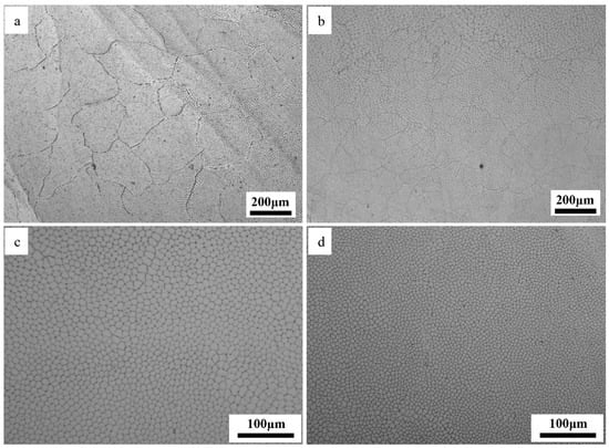 Figure 8 shows the microstructures of the alloy 1 specimen and alloy 2 specimen in the X–Y section. It is evident that the grain morphology of both the alloy 1 specimen and alloy 2 specimen is dominated by equiaxial crystals in the X–Y section. As shown in Figure 8a, the grain size distribution in the alloy 1 specimen is uneven, with the smallest grain size being only 29 μm, the largest grain size being 538 μm, and the average grain size being 311 μm. The grain size of the alloy 2 specimen clearly has become finer in Figure 8b, and its homogeneity has somewhat improved. With an average grain size of 206.22 μm, the alloy 2 specimen shows a grain refinement of almost 33.7% over the alloy 1 specimen. In addition, we can observe some fine cellular substructures, which are regularly arranged within the austenite grains, as depicted in Figure 8c,d. However, in the alloy 1 specimen, the size of the cellular substructures is significantly larger in some areas than in others. The cellular substructures in the alloy 2 specimen were not only smaller in size but also more homogeneous compared to those in the alloy 1 specimen. The average size of the cellular substructures in the alloy 2 specimen is 6 microns, which is about 45% smaller compared to cellular substructures in the alloy 1 specimen. It can be noted that the inclusion of a Cr, Mo, V, and N composite modifier refines not only the grain structure of the invar alloy specimen but also the cellular substructure within the grains.