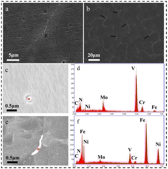 According to previous studies, different types of precipitated phases are formed when alloying elements are added to steel. In addition to being the core of heterogeneous nucleation or as the particle point pinning the grain boundary to hinder the grain growth and achieve the purpose of refining the microstructure, these precipitated phases can also be distributed near the grain boundary to hinder the movement of dislocations and achieve the effect of strengthening the alloy [27]. Figure 10a,b shows that there are two forms in the precipitated phase of the alloy 2 specimen. One type forms in a “chain-like” pattern along the grain boundaries, while the other type appears as irregularly shaped spheres inside the grains. These carbides and nitrides distributed within grain boundaries and grains can effectively refine the microstructure of the invar alloy specimen, as shown in Figure 8. The EDS analyses of Figure 10d and Table 2 show that the main chemical composition in the precipitated phase inside the grains is Cr-Mo-V-N-C. V is a strong carbide-forming element, which is easy to combine with C to form VC. Moreover, there is a strong chemical affinity between N and V. Therefore, V can react with C and N to form carbon and nitrogen composite phases (NC, VC) [28,29]. Cr and Mo are also carbide-forming elements and, therefore, can also react with C to form some carbides [30]. As can be seen from the EDS analysis in Figure 10f and Table 3, the precipitation phase at the grain boundaries contains a low content of Cr-Mo-V-C-N, indicating a low number of carbides and nitrides at the distributed grain boundaries. The reasons for this phenomenon include two main aspects: (1) Strong carbide-forming elements such as Cr, Mo, and V in the distributed grains have a strong trapping effect on C, which inhibits the diffusion of C, resulting in C elements that are not easy to aggregate at grain boundaries. (2) The precipitated phases at the cell wall of the cellular substructure inside the grain cause a certain degree of dislocation blockage, which also slows down the diffusion rate of the alloying elements (mainly C) to some extent.