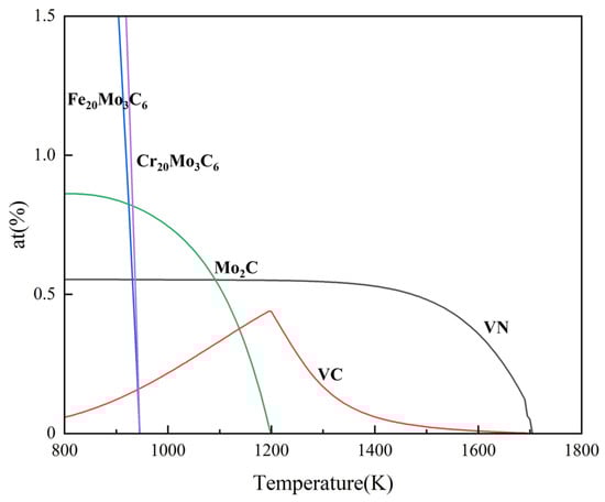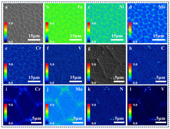 Figure 11 displays the element distribution inside the grain. In Figure 11a–e, the segregation of Cr, Mo, and Ni elements along the cell wall of the cellular substructure, and most of the precipitated phases within the grains are also distributed on the cell wall of the cellular substructure. In Figure 11k,l, the distribution position of V elements in the cell wall of the cellular substructure is highly coincident with C and N elements, indicating that V elements react with C and N elements to form some carbides and nitrides. In addition, the distribution positions of Cr and Mo basically coincide with C elements, and combined with the thermodynamic calculations in Figure 12, it can be seen that these carbides and nitrides are mainly VC, VN, Mo2C, Fe20Mo3C6, and Cr20Mo3C6. According to previous studies, there are high-density dislocations in the cell walls of the cellular substructure inside the austenitic steel grains. The elemental segregation and precipitation phases at the cell wall of the cellular substructure can effectively hinder the movement of dislocations, thereby improving the strength of the material [31,32]. This is consistent with the results of the EBSD analysis in Figure 9.