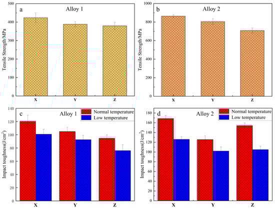 It can be seen from Figure 13 that the alloy 1 specimen and alloy 2 specimen have common characteristics of tensile and impact properties. The mechanical properties of alloy 1 specimen and alloy 2 specimen in the X direction are better than those in the Y and Z directions. During deposition, since the X direction is parallel to the direction of the deposited weld bead, the microstructural distribution in the X direction is relatively simple, and there is no cyclic alternation of fine grain zones, columnar crystal zones, and HAZ, so the mechanical properties in this direction are optimal [33]. In Figure 13a, the tensile strength of the alloy 1 specimen in the X, Y, and Z direction is 424 MPa, 389 MPa, and 380 MPa, respectively, with an average tensile strength of 398 MPa. In Figure 13b, the tensile strengths of the alloy 2 specimen in the X, Y, and Z directions were 864 MPa, 805 MPa, and 709 MPa, respectively, with an average tensile strength of 793 MPa. The average tensile strength of the alloy 2 specimen increased by about 99% compared with that of the alloy 1 specimen. However, the difference in tensile strength between the X and Z directions of the alloy 2 specimens is more significant. In the Z direction of the alloy 2 specimen, the HAZ, columnar zone, and fine grain zone are cyclically distributed, where some of the low melting point second-phase particles in the HAZ are dissolved in the matrix due to multiple thermal cycles, which weakens the pinning effect of the second phase particles in the HAZ to the grain boundaries and dislocations. Therefore, the HAZ in the Z direction of the alloy 2 specimen is prone to become the area of crack initiation and propagation during the tensile process, which leads to a decrease in tensile strength in the Z direction. The distribution of the microstructure and precipitated phase in the X direction of the alloy 2 specimen is relatively uniform, and the tendency to produce stress concentrations in the X direction is lower during the tensile process; therefore, the difference in tensile strength between the X and Z directions of the alloy 2 specimen is more significant. Figure 13c,d show the impact toughness of the alloy 1 specimen and alloy 2 specimen at room temperature and low temperature (−196 °C), respectively. The average impact toughness of the alloy 1 specimen at room temperature and low temperature is 107 J/cm2 and 90 J/cm2, respectively, and the impact toughness of the alloy 2 specimen at room temperature and low temperature (−196 °C) is 151 J/cm2, 111 J/cm2. The average impact toughness of the alloy 2 specimen was 39% and 23% higher than that of the alloy 1 specimen at room temperature and low temperature, respectively.