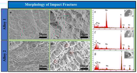 Morphology of impact fracture: (a,b) alloy 1 specimen, (c,d) alloy 2 specimen, and (e–g) element composition of inclusions in the dimple of alloy 2 specimen.