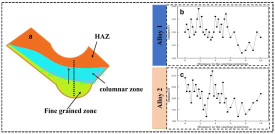 Microhardness of alloy 1 specimen and alloy 2 specimen. (a) Distribution of microhardness test points. (b,c) The hardness values at different locations in alloy 1 specimen and alloy 2 specimen.