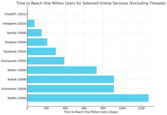 As illustrated in Figure 2, ChatGPT’s capabilities have led to its widespread use in various fields, including healthcare [,], business [], education [,], and content creation []. Remarkably, ChatGPT reached one million users within just five days of its launch, a feat that took Netflix three-and-a-half years and Instagram two-and-a-half months to achieve [].