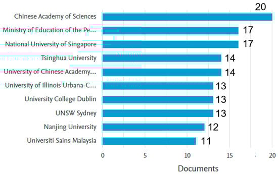 Further analysis of GAI research related to security was conducted by examining the contributions of academic and research institutions worldwide. Figure 6 presents the numbers of documents published by leading institutions, offering insight into the primary contributors in the field.