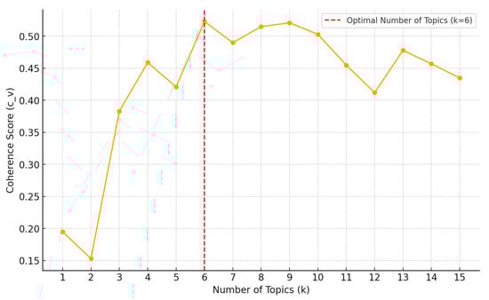 To determine the optimal number of topics for LDA modeling, the parameters were set following the methodology outlined by Kim et al. []. Specifically, α was set to 0.1, β to 0.01, and the number of iterations to 1000. The number of topics was gradually increased from two to fifteen to evaluate the coherence scores, a critical metric for assessing the interpretability of the topics generated by the model.