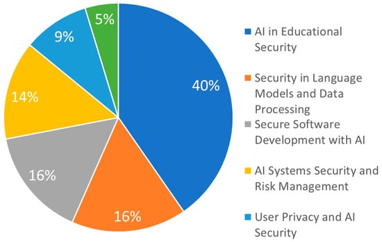 The fourth theme, “Security and Risk Management of AI Systems” (14%), focuses on the security and risk management of AI systems. Keywords like “security”, “system”, “AI”, and “technology” indicate research into the inherent vulnerabilities of AI systems and the necessary security considerations during their development. Charfeddine et al. (2024) investigated the dual role of ChatGPT in cybersecurity, analyzing both its benefits and risks. The study recommended comprehensive threat analysis, the implementation of misuse prevention mechanisms, and the establishment of secure development environments as essential measures for managing the risks associated with AI systems [].