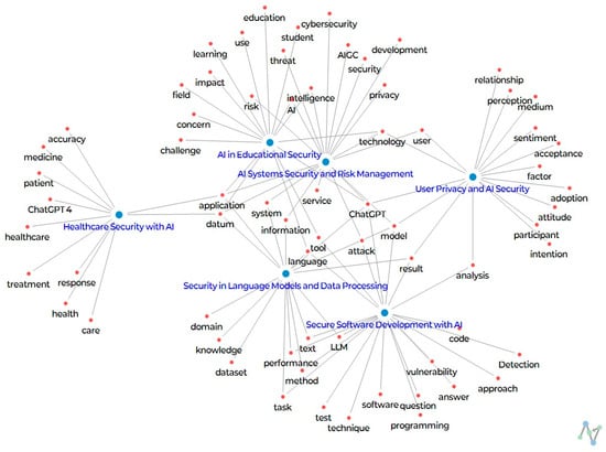 In conclusion, the common keywords identified in this network visualization—such as “ChatGPT”, “security”, “data”, “privacy”, and “system”—serve as critical connectors between various topics, illustrating broader themes that are relevant across multiple domains. These keywords underscore the interconnectedness of AI security issues and highlight the need for a holistic security strategy that addresses concerns ranging from data integrity to user privacy, while also ensuring the overall security of AI systems. Understanding the significance of these keywords provides valuable insight into the challenges of AI security, guiding both research and practice toward more integrated and effective solutions. The visualization not only maps out specific areas of focus within AI security but also emphasizes critical cross-cutting issues that require attention, contributing to the development of robust and resilient AI technologies that are capable of safely supporting a wide range of applications.
