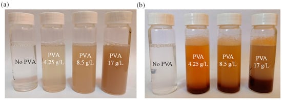 Visual appearance of PVA solutions with different concentrations (a) before and (b) after ferrite treatment. The solutions from left to right contain PVA at concentrations of 0 (No PVA), 4.25, 8.5, and 17 g/L, respectively. The color changes and solution uniformity reflect the interaction between PVA molecules and ferrite treatment process.