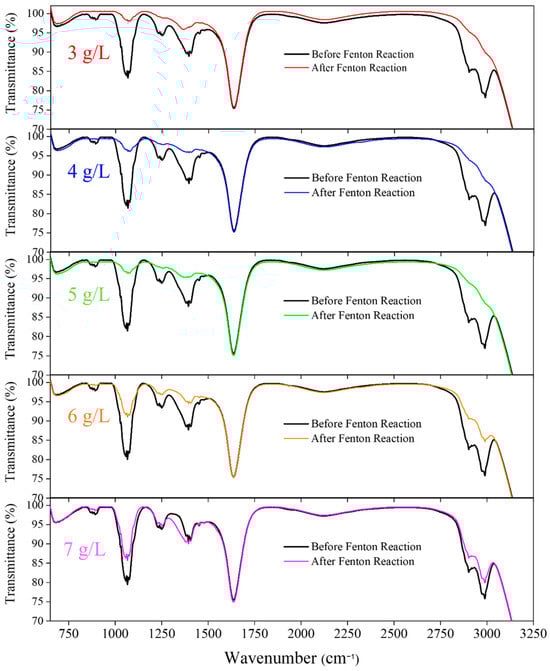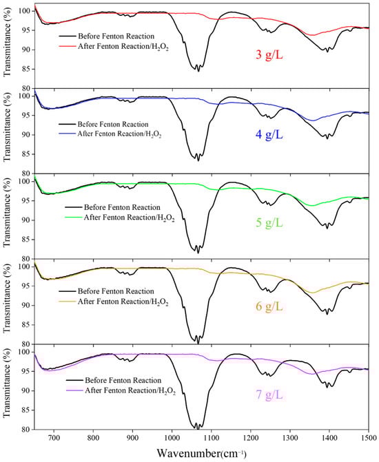 The introduction of H2O2 significantly improved the treatment process through pH regulation and enhanced oxidation. Without H2O2, high-concentration PVA solutions (5–7 g/L) showed reduced pH values (pH 7–8), potentially affecting ferrite formation and PVA removal efficiency. After H2O2 addition, pH levels remained around 12 across all concentrations, providing more favorable conditions for ferrite formation. FTIR spectral analysis, as shown in Figure 5, revealed significant changes in the C–O stretching vibration peak at 1100 cm−1 across all concentrations. At lower concentrations (3–4 g/L), this characteristic peak intensity notably decreased, indicating H2O2-promoted C–O bond cleavage in PVA molecules. Absorption peak changes in the 700–900 cm−1 and 1200–1500 cm−1 regions became more pronounced, suggesting that H2O2 affected both PVA main chain structure and side chain oxidative degradation. Although spectral changes were relatively minor at higher concentrations (6–7 g/L), treatment efficiency still improved compared to experiments without H2O2.