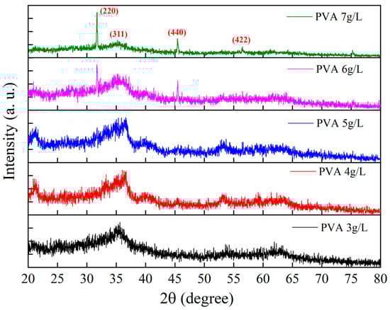 Figure 3 shows the XRD pattern analysis, revealing significant structural differences in precipitates formed under varying PVA concentrations. Within the PVA concentration range of 3–5 g/L, the diffraction patterns exhibit typical amorphous characteristics, primarily manifested as a broadened diffraction peak around 35°. This broadening feature indicates that the formed iron oxides possess either low crystallinity or nanoscale grain sizes, possibly due to the interfering effects of PVA molecules during the crystallization process [,]. When PVA concentration increases to 6 g/L, besides the broadened background, a sharp diffraction peak begins to emerge near 31.72°, potentially corresponding to the (220) crystal plane of Fe3O4. This change suggests that higher PVA concentrations may promote preferential growth of certain crystal planes. Notably, at the high concentration of 7 g/L, the diffraction pattern displays the most distinct crystalline characteristics, with prominent diffraction peaks at 31.7° and 45.4°, corresponding to the (220) and (440) crystal planes of Fe3O4, respectively. This concentration-dependent structural evolution reveals the dual role of PVA in iron oxide formation: at low concentrations, it primarily inhibits crystallization, while at higher concentrations, it may promote the growth of specific crystal planes through molecular arrangements. However, XRD data alone are insufficient to definitively determine the specific iron oxide phases, necessitating comprehensive assessment through magnetic testing and other characterization methods. Furthermore, the influence of PVA concentration on crystallinity provides potential pathways for controlling the structure and properties of the final products. The concentration-dependent structural evolution observed in this study reveals the dual role of PVA in iron oxide formation, which has not been previously reported. While Mohammed et al. [] observed that PVA could inhibit Fe3O4 crystallization, they did not investigate the concentration-dependent effects. Our findings demonstrate that at low concentrations (3–5 g/L), PVA primarily inhibits crystallization, whereas at higher concentrations (6–7 g/L), it promotes the growth of specific crystal planes through molecular templating. This differs from the results of Gupta et al. [], who studied Fe3O4/PVA composites but did not observe the concentration threshold effect we identified. This novel finding provides insights into controlling the crystallinity and morphology of magnetic materials through PVA concentration adjustment.